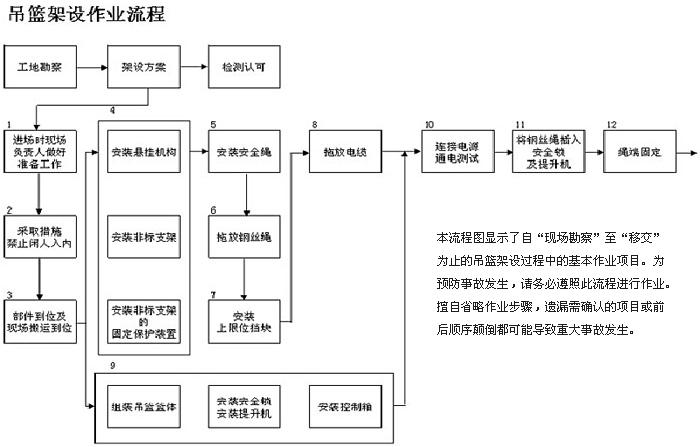 為確保設(shè)備安全、高效的運行,使用方須嚴(yán)格遵照“高處懸掛作業(yè)安全規(guī)程”及如下操作規(guī)程使用高處作業(yè)吊籃。1. 吊籃操作人員須經(jīng)過培訓(xùn)持證上崗。2. 設(shè)備用于涂裝工程的,采取防護(hù)措施后方可投入使用。3. 每天使用設(shè)備前,吊籃操作人員須按高處作業(yè)吊籃日常檢查表所載項目進(jìn)行檢查。4. 乘坐吊籃的人員須戴好安全帽、系好安全帶并將其掛扣在安全繩上。5. 高處作業(yè)使用的工具及物品須采取防墜落措施。6. 吊籃應(yīng)經(jīng)有關(guān)部門檢測合格后方可投入使用。7. 嚴(yán)禁將吊籃當(dāng)做材料及人員的垂直運輸工具使用并嚴(yán)格控制載荷。8. 設(shè)備發(fā)生故障時,須立即停止使用并通知乙方修理。9. 設(shè)備在升降時,吊籃操作人員須密切注意電纜線是否掛卡在墻面或障礙物上。10. 施工場所風(fēng)力大于6級(相當(dāng)于風(fēng)速10.8m/s)以上時,應(yīng)停止吊籃使用。11.每天下班停用時,應(yīng)將設(shè)備停放至地面或用繩索將設(shè)備固定在建筑物上避免隨風(fēng)晃動。12.每天下班停用時,應(yīng)切斷電源、鎖好電箱門以免他人擅自使用。